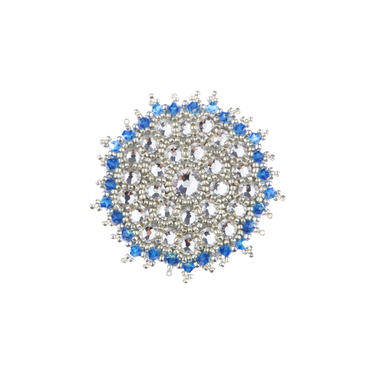 Objavte originálnu ručne vyrábanú brošňu No. 270 zo striebornej kolekcie Dew. Tento šperk s priemerom 4 cm kombinuje nádheru Swarovski kryštálov s jemnými postriebrenými Miyuki korálkami.