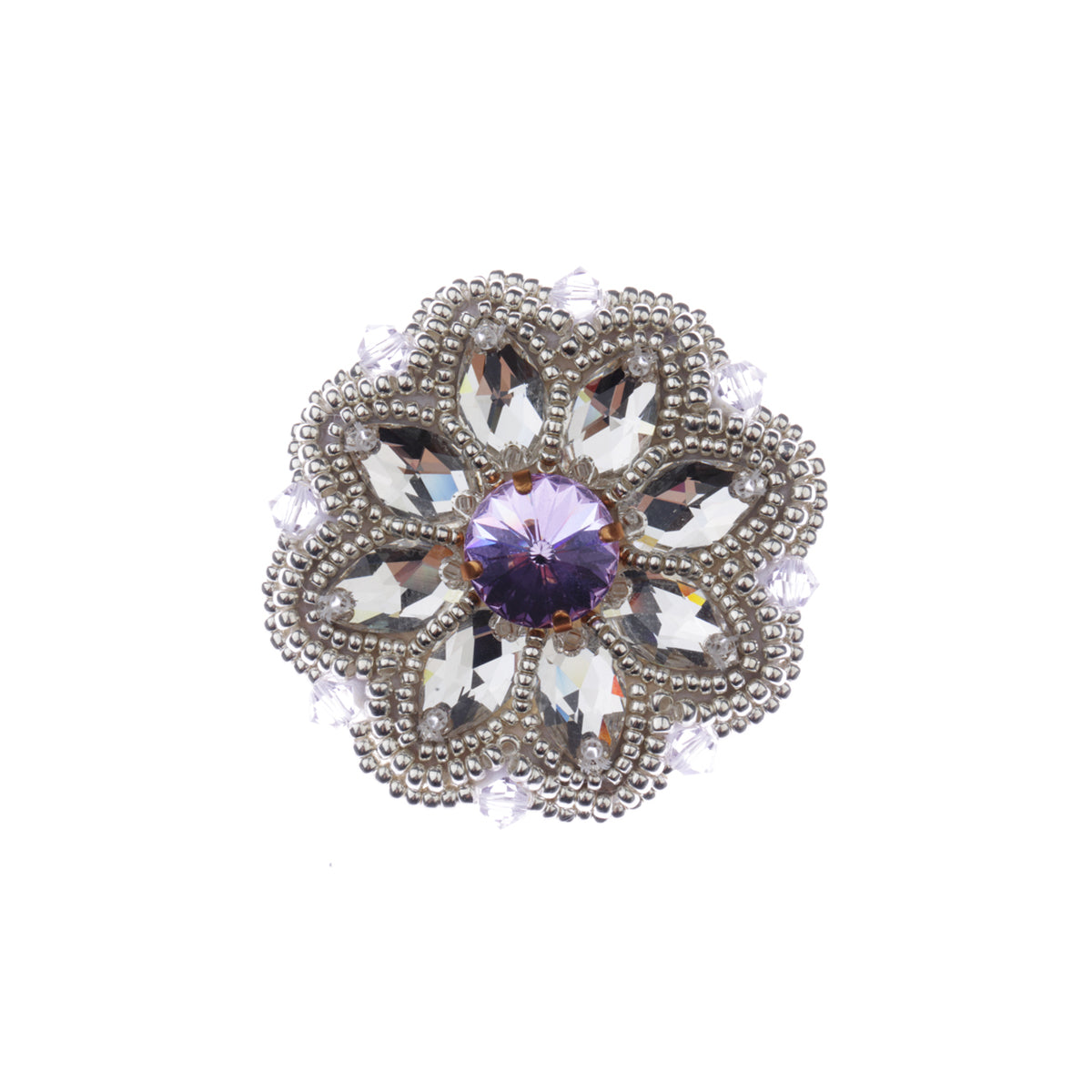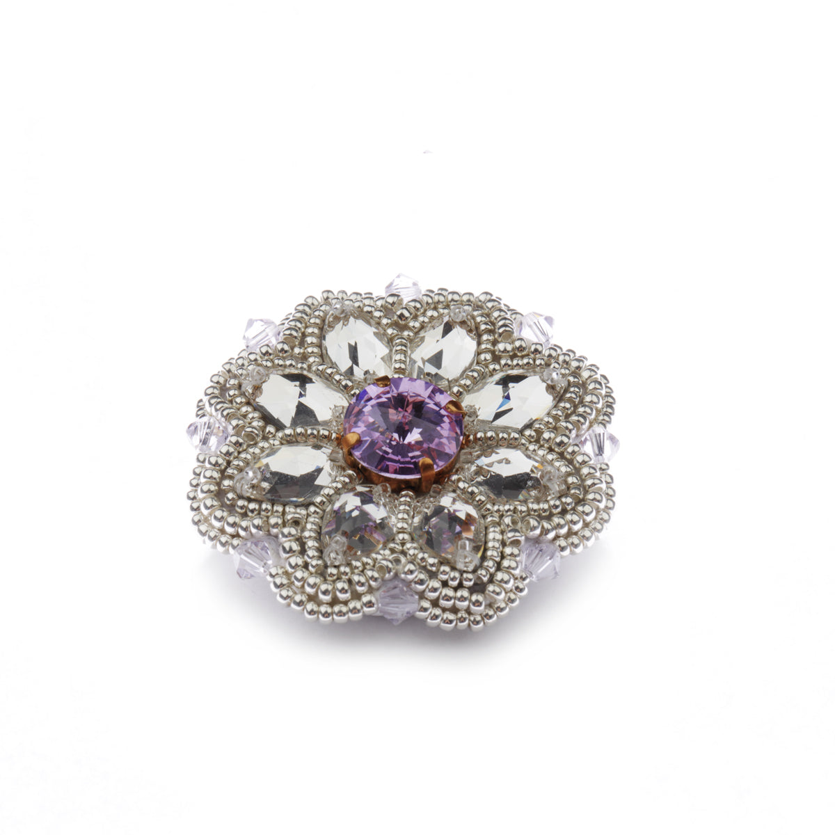 Objavte originálnu brošňu Dew No. 329, ručne vyrobenú zo skvostných Swarovski kryštálov a jemne prišitých postriebrených Miyuki korálok. S priemerom 4,5 cm a váhou pod 10g je táto brošňa tak ľahká, že ju môžete nosiť aj na najjemnejších materiáloch ako je hodváb.