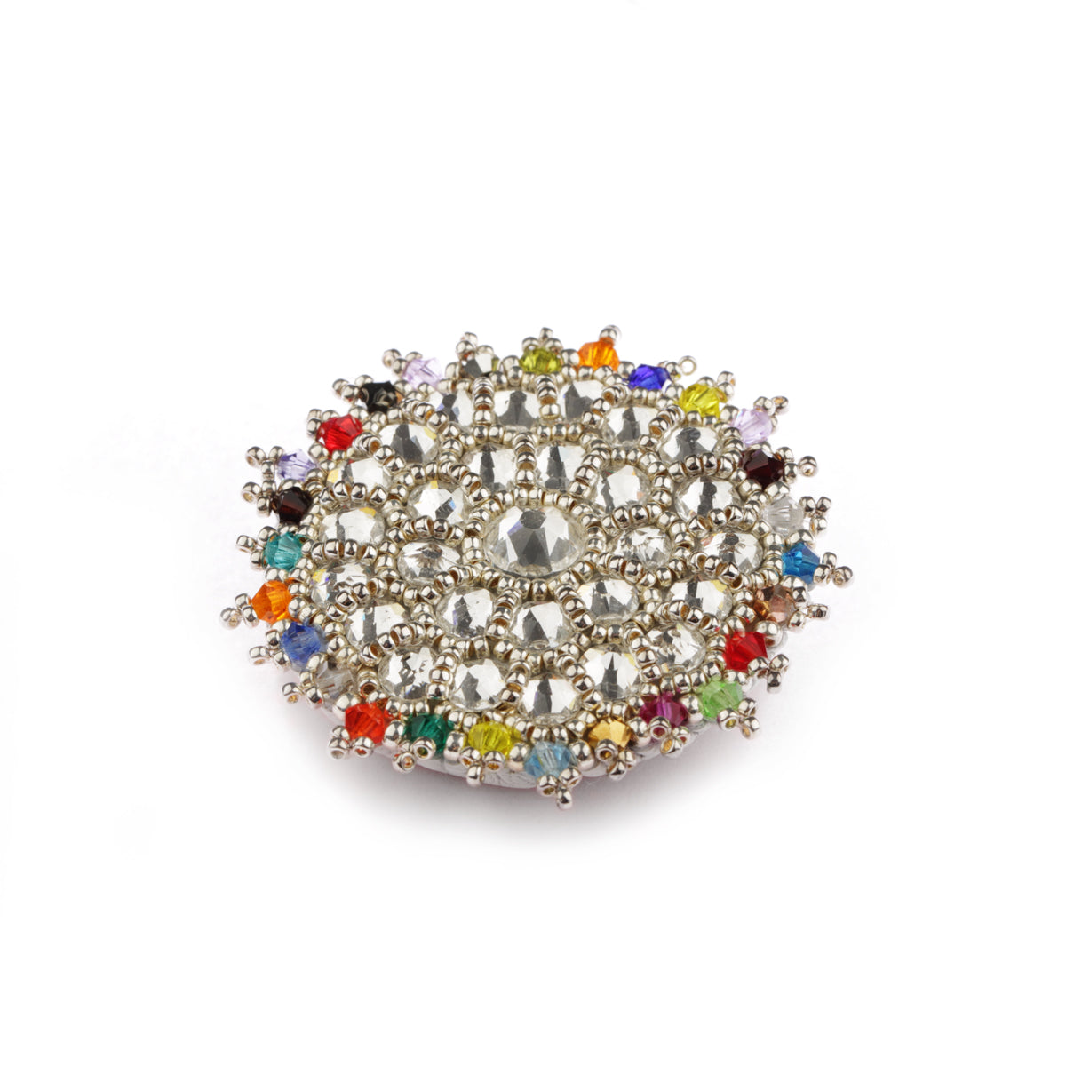 Originálna ručne robená brošňa zo striebornej kolekcie Dew s priemerom 4 cm. Tento jemný šperk je vyrobený z luxusných Swarovski kryštálov a zvlášť prišitých postriebrených Miyuki korálok.