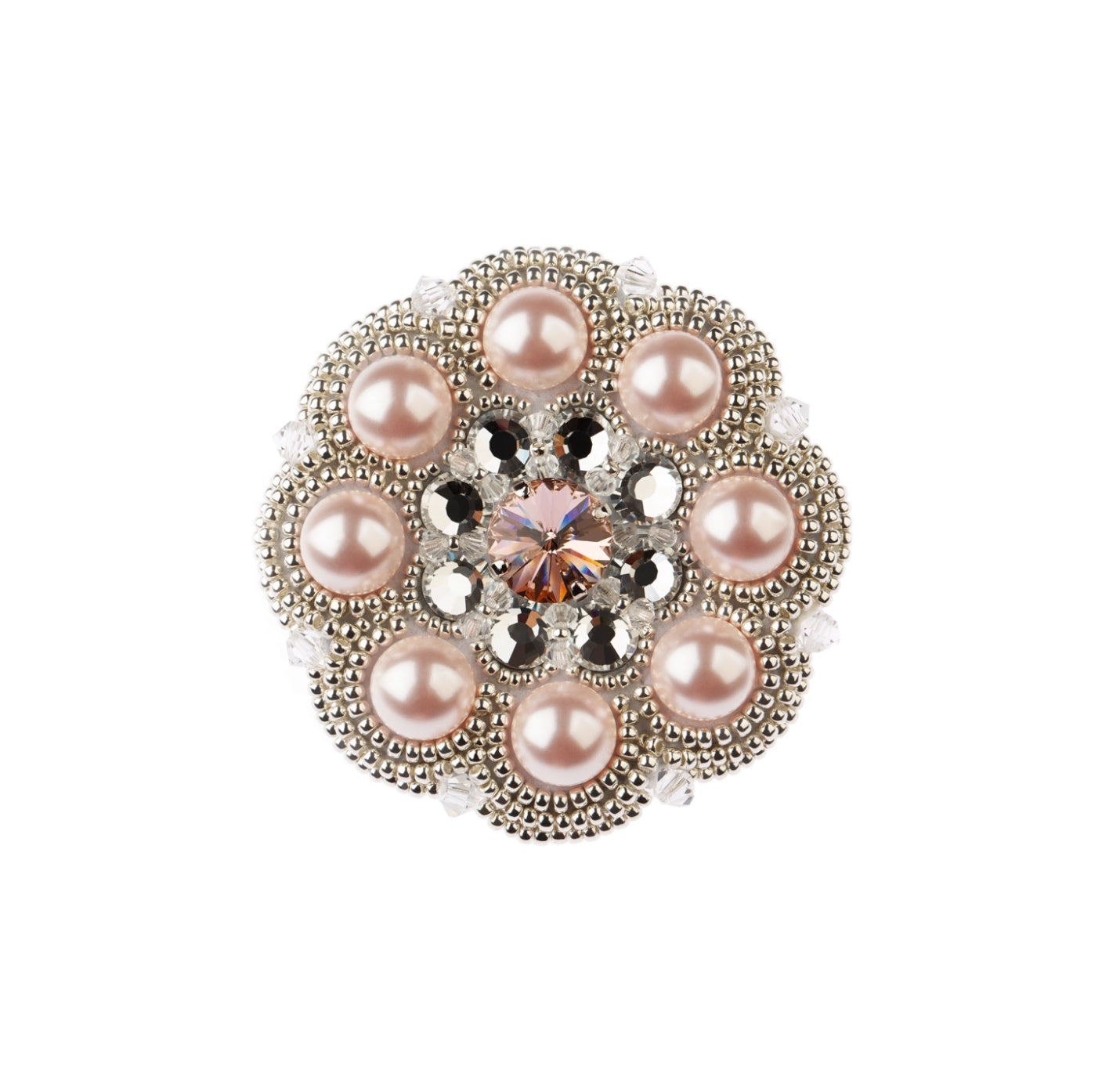 Originálna ručne robená brošňa No. 03 z kolekcie Skvost x Minidiamond s priemerom 6 cm. Tento jemný šperk váži menej ako 15g, čo umožňuje jeho nosenie aj na hodvábnom oblečení.