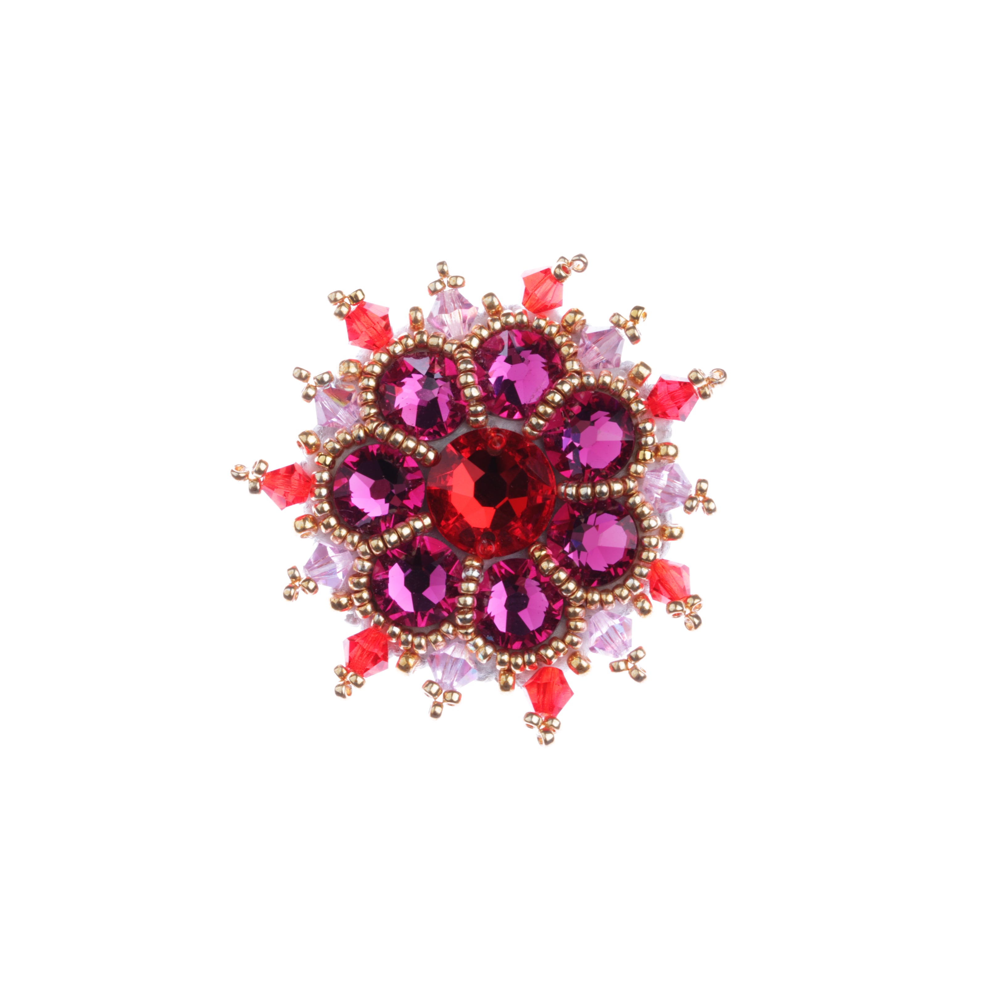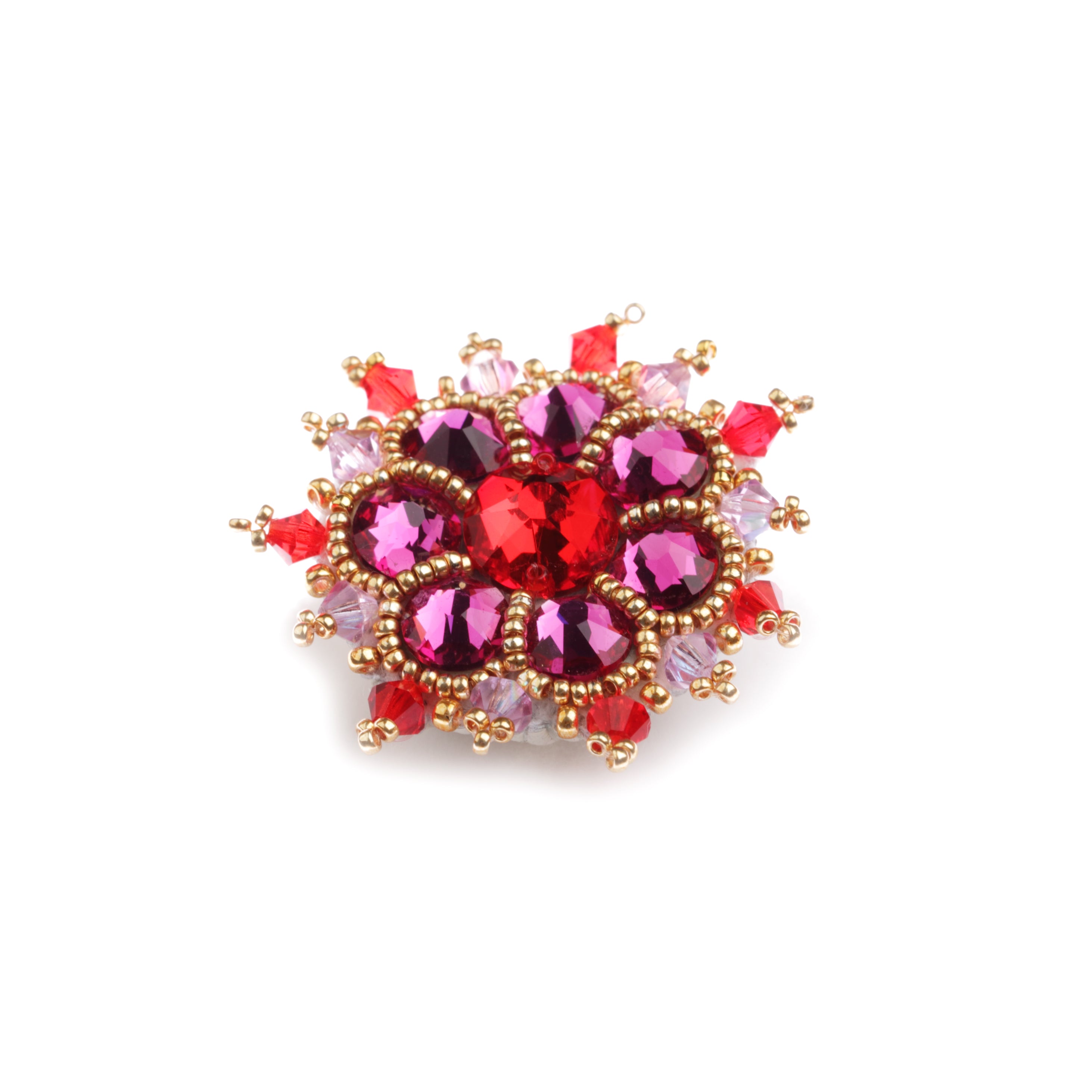 Exkluzívna brošňa z jarnej kolekcie s priemerom 3,5 cm. Šperk je vyrobený z luxusných Swarovski kryštálov a pozlátených Miyuki korálok, ktoré sú ručne prišité.