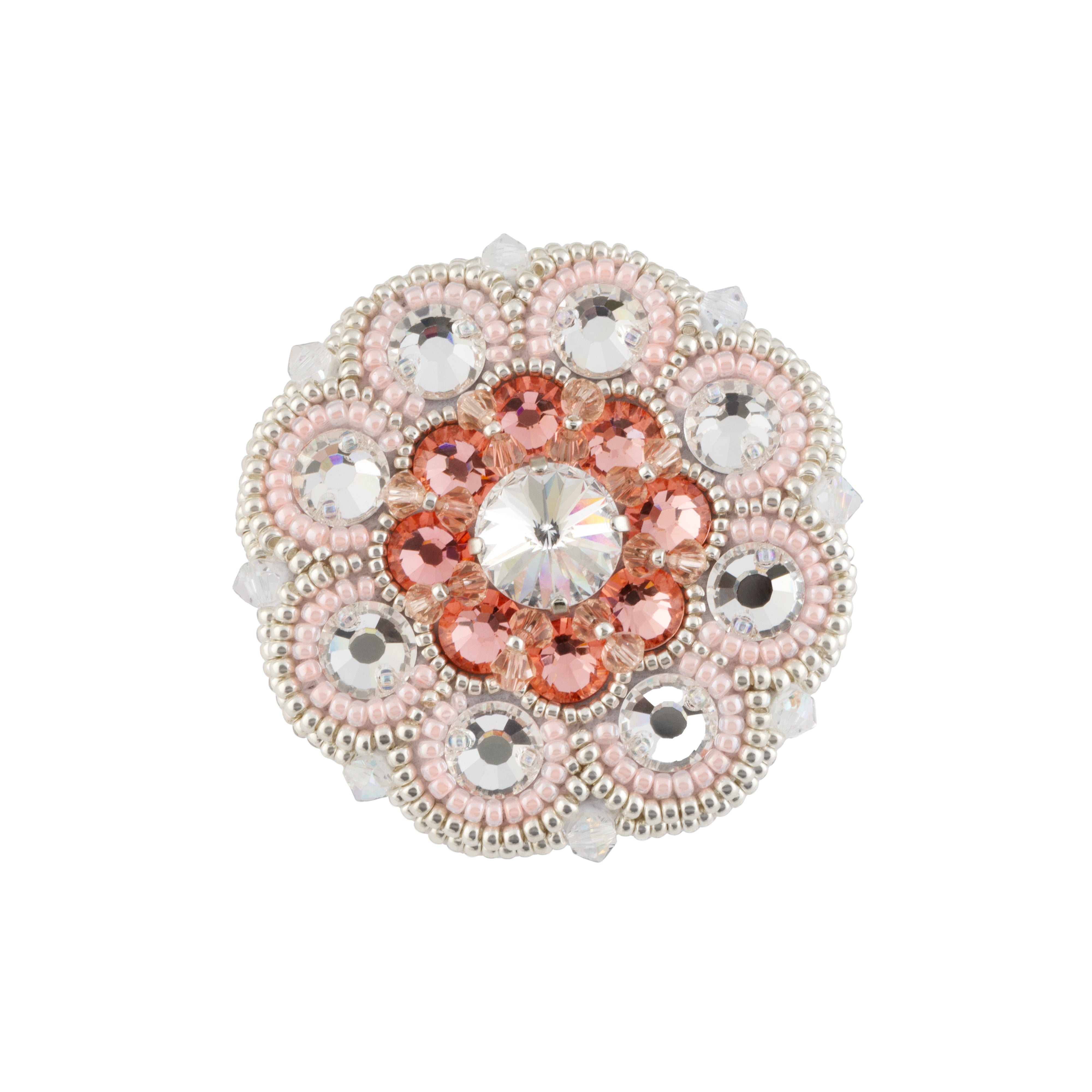 Originálna ručne vyrobená brošňa No. 05 z kolekcie Coco Legacy s priemerom 5 cm. Tento jemný a elegantný šperk je vyrobený z nádherných Swarovski kryštálov a dômyselne prišitých postriebrených a ružových Miyuki korálok.