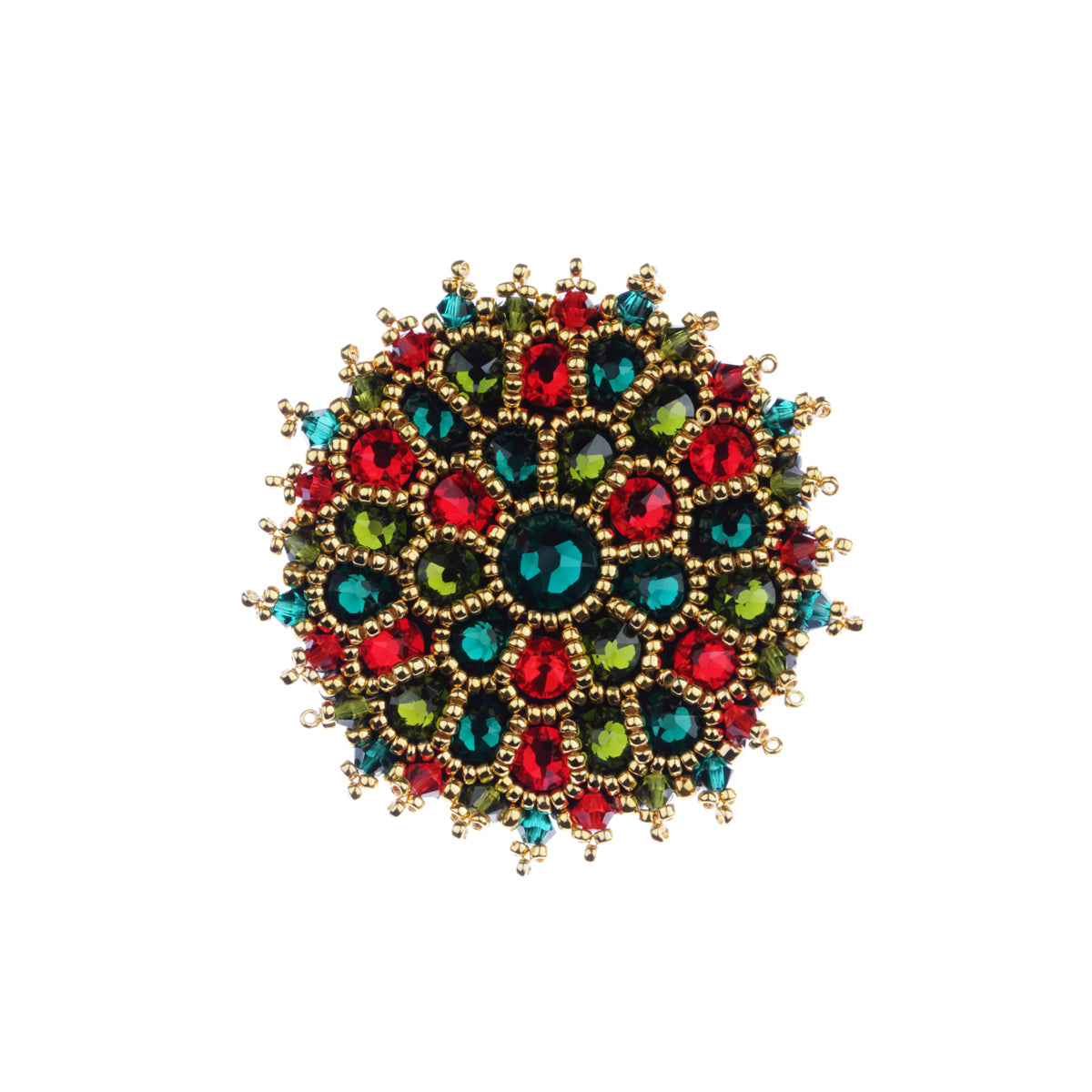 Originálna ručne robená brošňa s priemerom 4 cm z exkluzívnej jesennej kolekcie. Šperk je vytvorený z luxusných Swarovski kryštálov a špeciálne prišitých pozlátených Miyuki korálok.