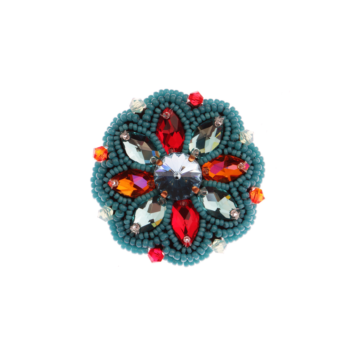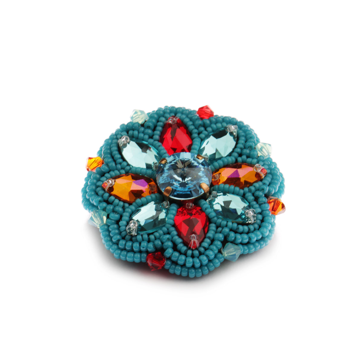Objavte brošňu Summer No. 73 z našej limitovanej letnej kolekcie. Tento ručne vyrábaný šperk s priemerom 4,5 cm kombinuje nádheru Swarovski kryštálov s detailne prišitými modrými Miyuki korálkami.