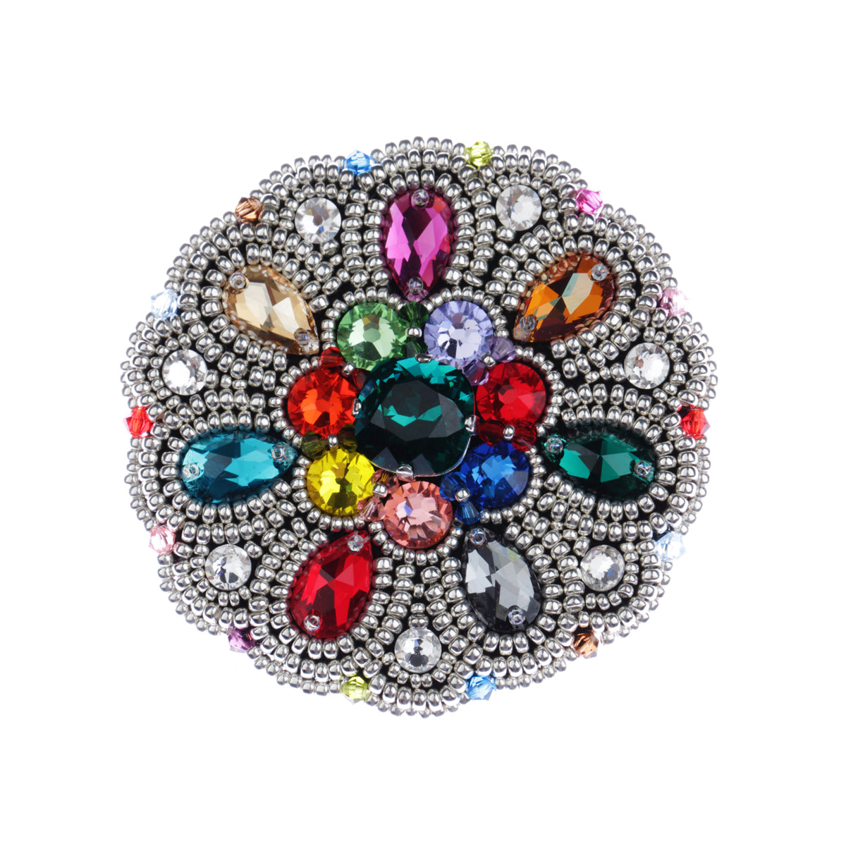 Original handmade brooch No. 507 from the colorful Aurora collection featuring a 6.2 cm diameter. This exquisite piece is crafted with magnificent Swarovski crystals and separately embroidered silver-plated Miyuki beads.