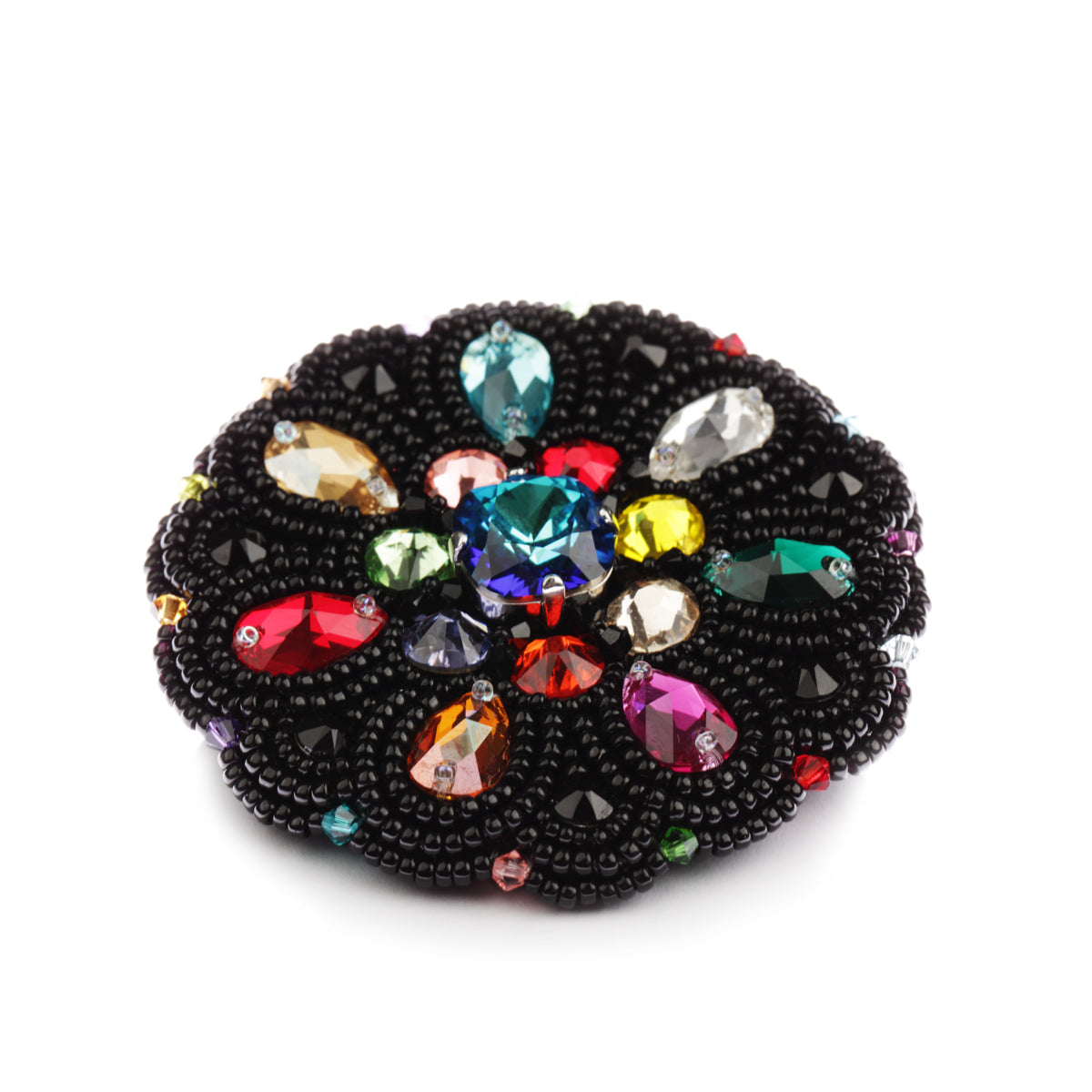 Original handmade brooch No. 508 from the colorful Aurora collection, featuring a 6.2 cm diameter design. This exquisite piece is crafted with magnificent Swarovski crystals and separately embroidered black Miyuki beads.