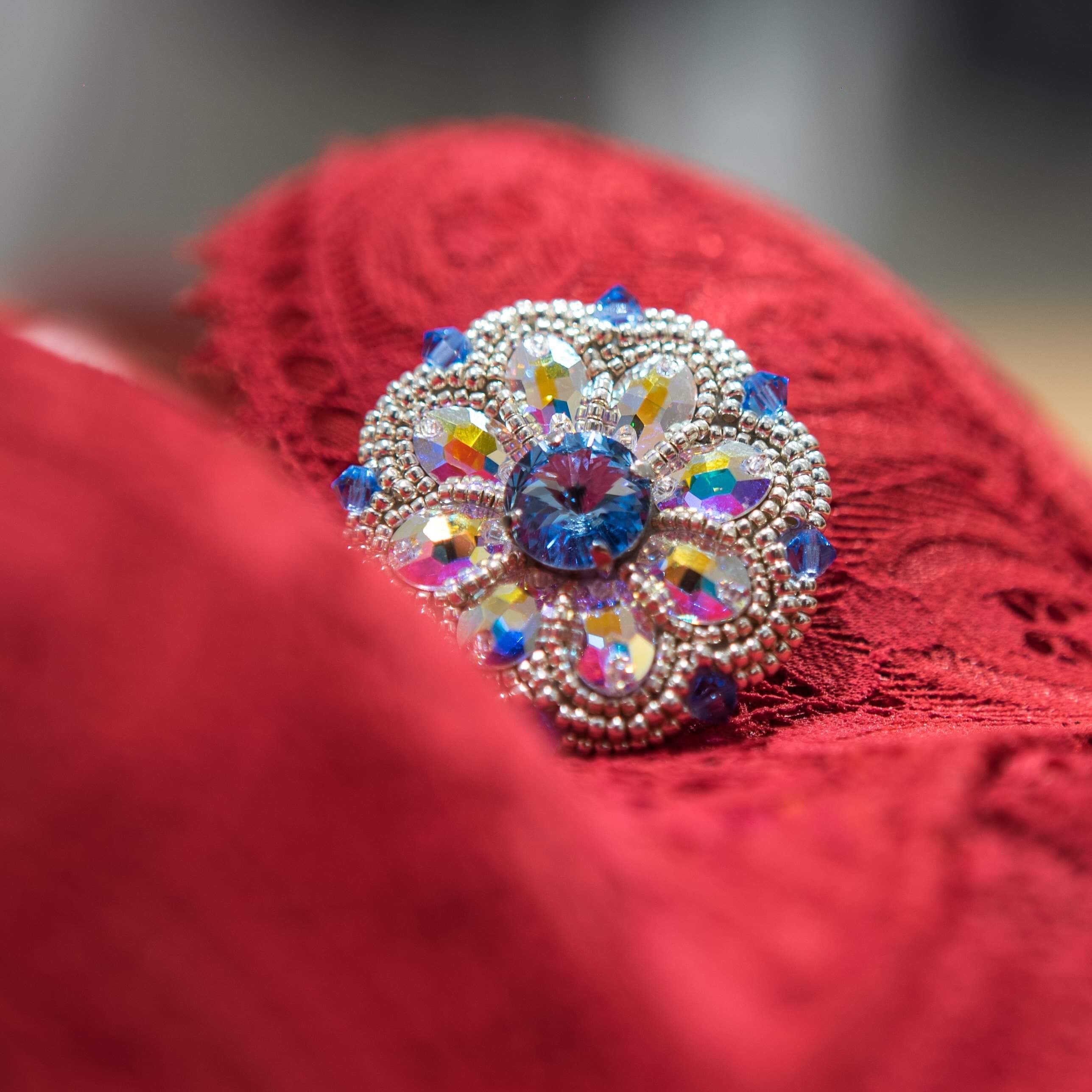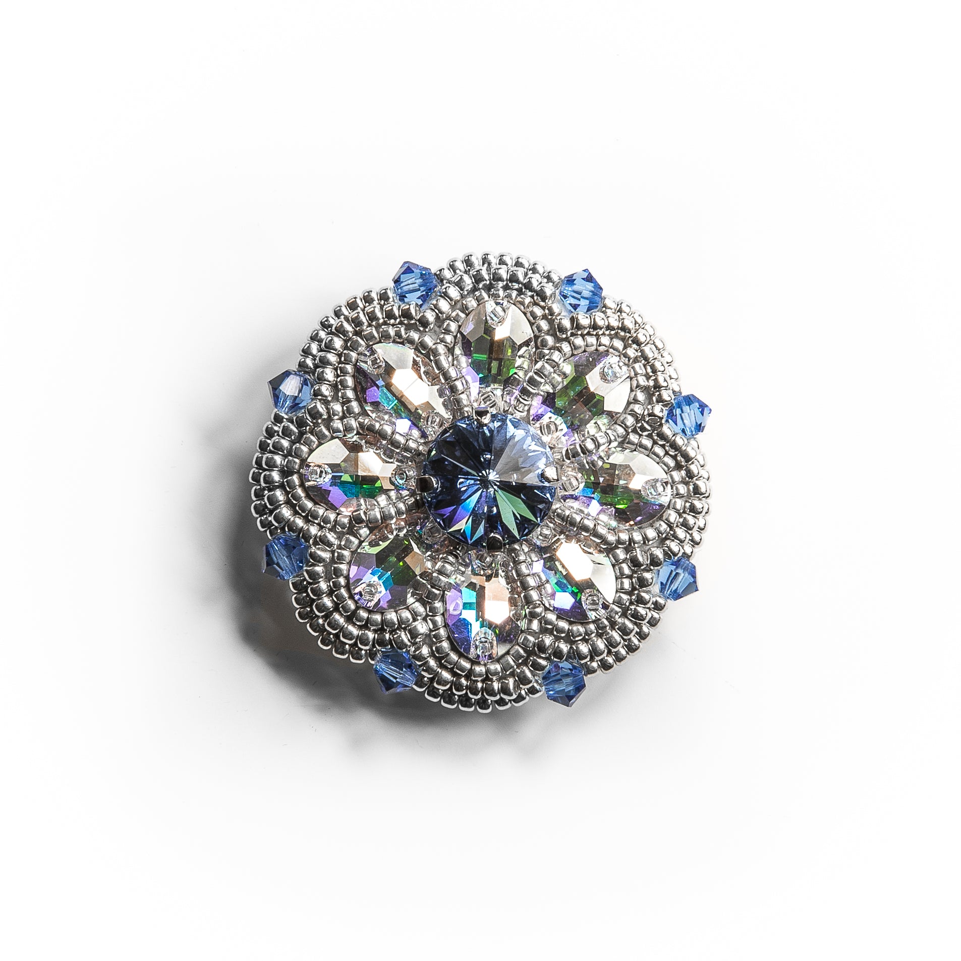 This stunning piece features a 4.5 cm diameter and is crafted with magnificent Swarovski crystals and individually embroidered Miyuki beads. Weighing less than 15 grams, this lightweight brooch can be comfortably worn even on delicate fabrics like silk.