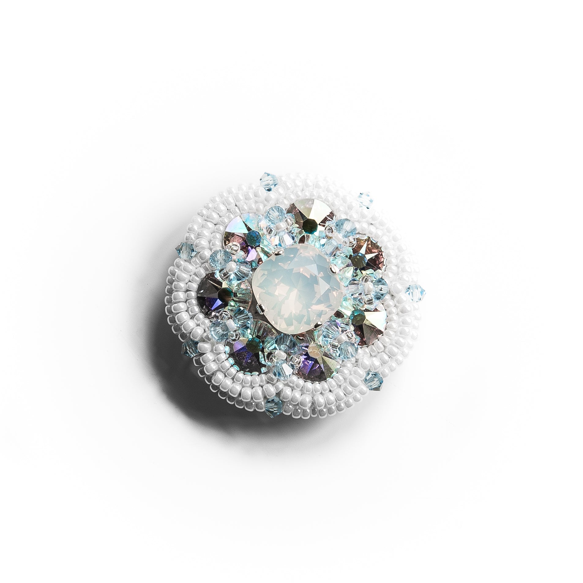 This stunning piece features a 4.5 cm diameter and is crafted with magnificent Swarovski crystals and individually embroidered white Miyuki beads.